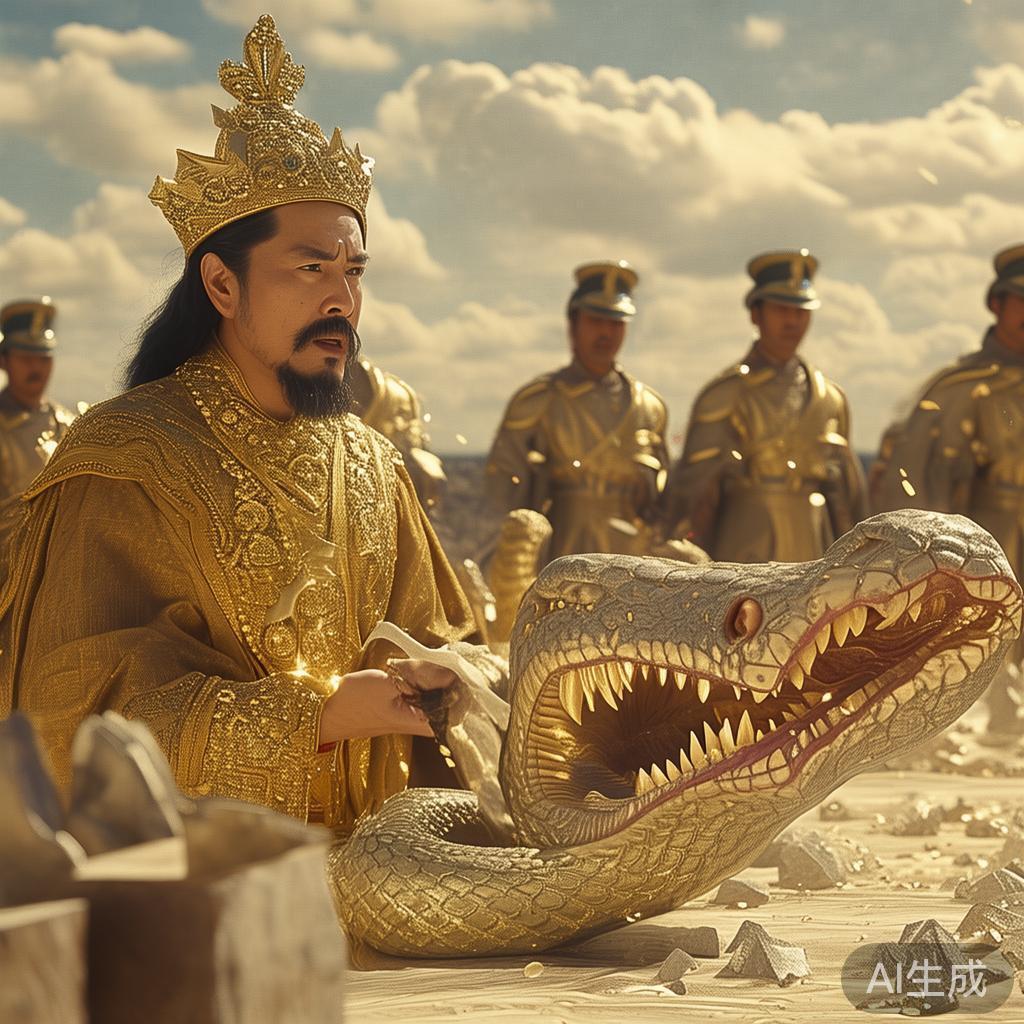 皇帝得到神笔后,试图通过画一些金山来改变局面。可结果画来画去,所有化作的都是一堆堆石头,还差点砸伤了自己的脚。皇帝觉得不甘心,又换金砖,没想到最后画出来的是一条长蛇,张嘴欲噬,幸亏卫兵及时出手,否则麻烦可大了。